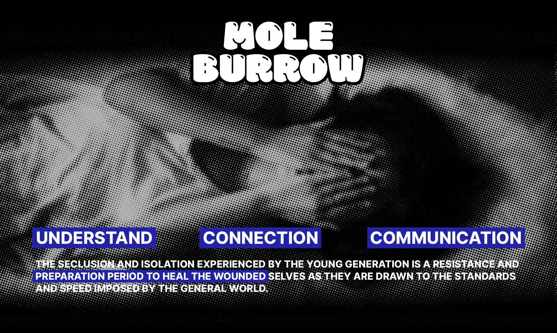 [두더지 땅굴]은 현재 사회적 문제로 심화되고 있는 은둔고립 청년 문제를 해소하고, 지원하기 위한 온라인 소통 플랫폼입니다. 해당 프로젝트의 핵심 타겟인 은둔고립 청년들은 모두 저마다 하나씩 마음의 상처와 트라우마를 가지고 마음의 문을 쉽게 열지 못해 어려움을 겪고 있었습니다. 이렇듯 도움이 필요한 은둔고립 청년들이 다양한 지원과 활동을 통해 스스로 활동하고 서로가 연결될 수 있도록 체계적인 디자인 전략수립부터 세부 디자인 개발까지 진행하였습니다.